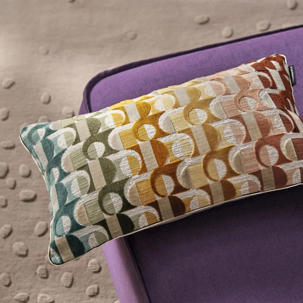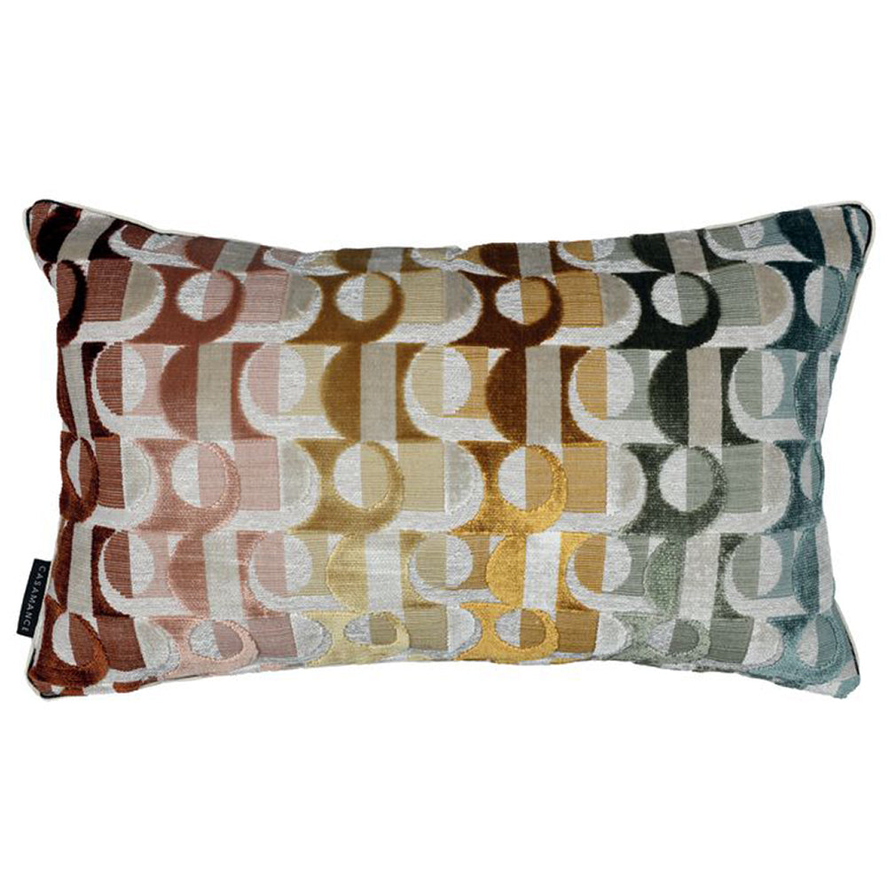 This cushion is made from the multicolored Abondance fabric, a pinned velvet jacquard cut from viscose, with a soft touch. From ochre to bluish-grey, the motifs borrow from blush, vanilla, khaki, olive, celadon and navy tones, without ever repeating themselves.