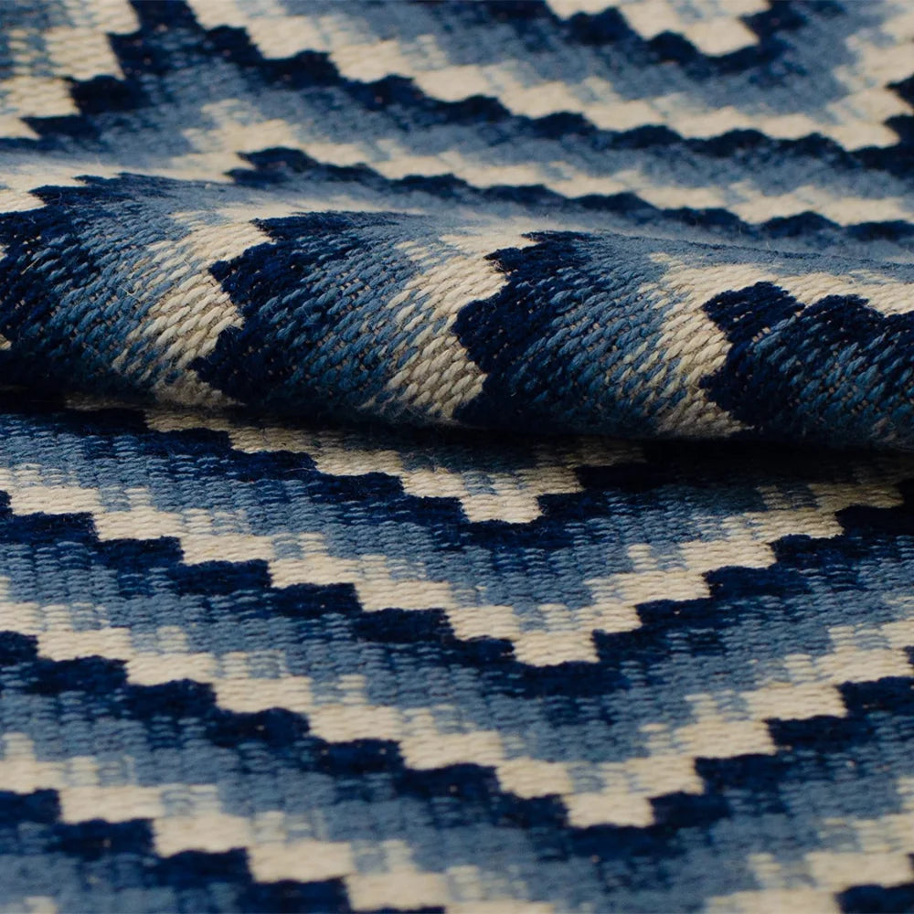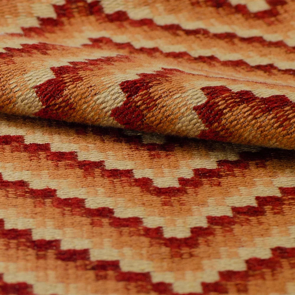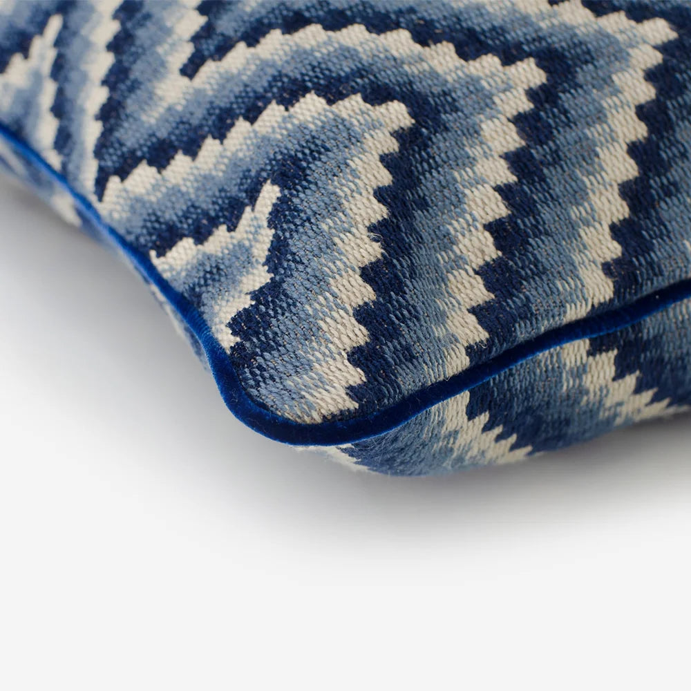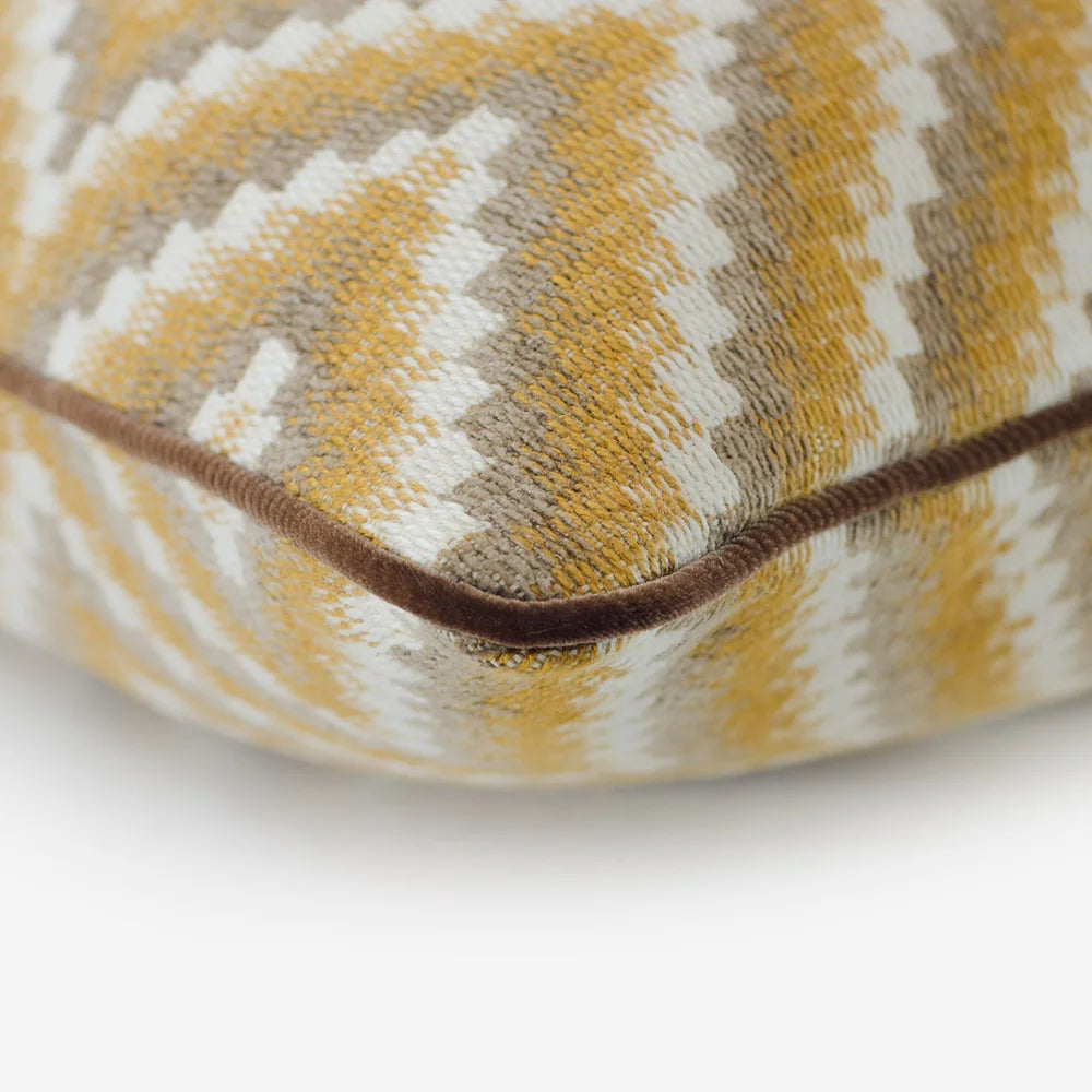 This Prato cushion from Josephine Testa has a multiple-colour modern chevron design, woven on a cotton warp with coarse linen textures, covered with a contrasting velvet colour trim.